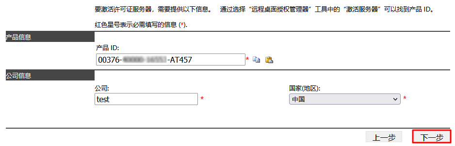8. 输入 步骤6 获取的产品 ID,并根据实际情况填写公司信息后,单击下一步。如下图所示: