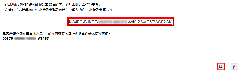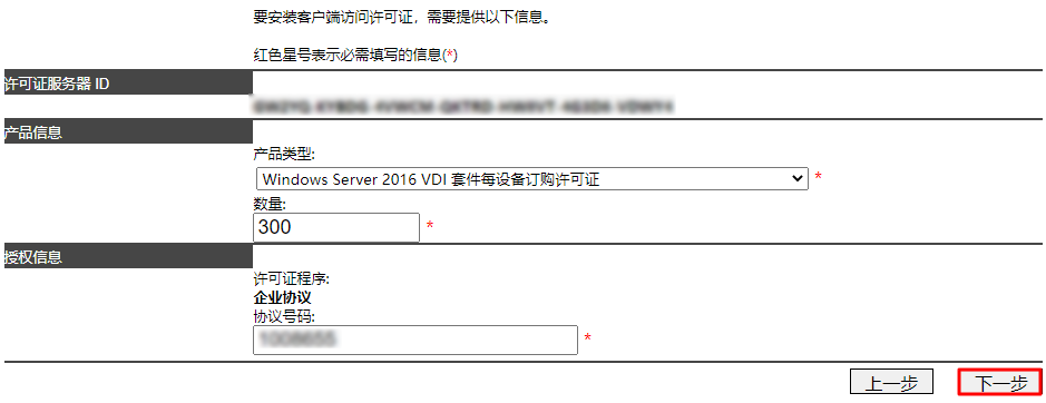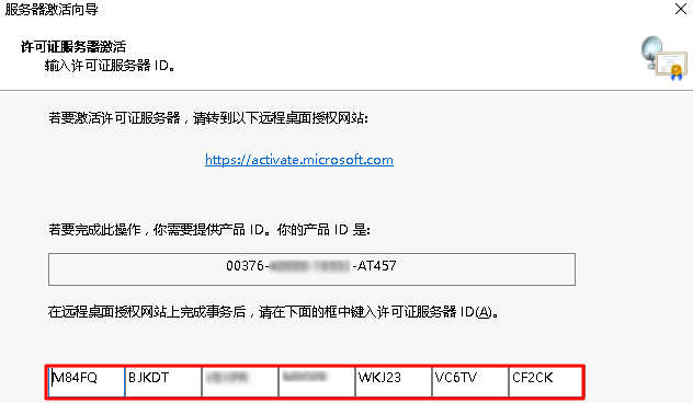 6. 在许可证服务器激活中,输入 步骤10 获取的许可证服务器 ID,并单击下一步。如下图所示: