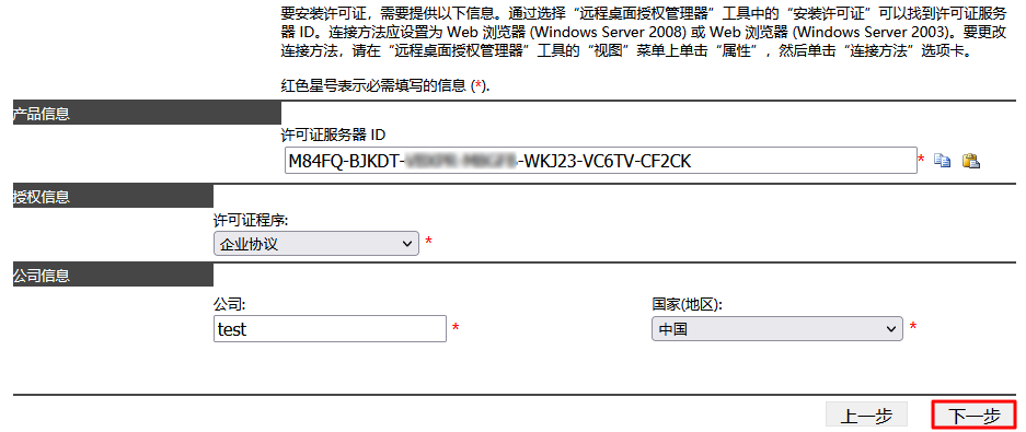 11. 输入上一步获取的许可证服务器 ID,并按需选择权信息,填写公司信息后单击下一步。如下图所示: