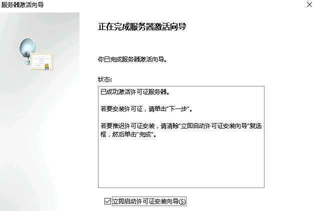 7. 当服务器激活向导窗口中提示你已完成服务器激活向导时,单击下一步进入许可证安装步骤。如下图所示: