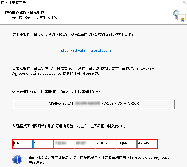 2. 在获取客户端许可证密钥包中,输入 步骤14 获取的密钥包 ID,并单击下一步。如下图所示: