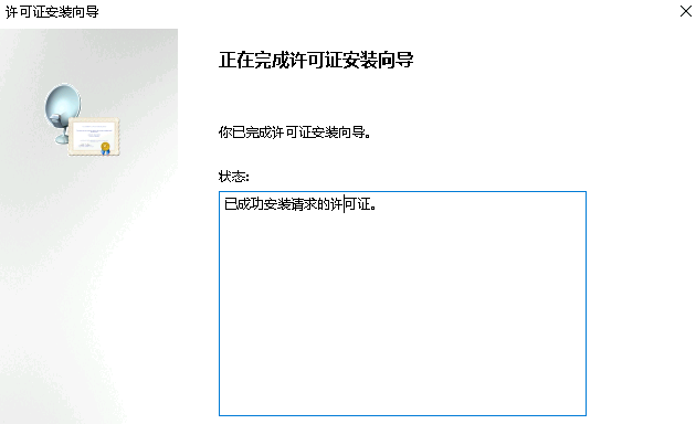 3. 当许可证安装向导窗口中提示你已完成许可证安装向导即表示已成功安装许可证。如下图所示: