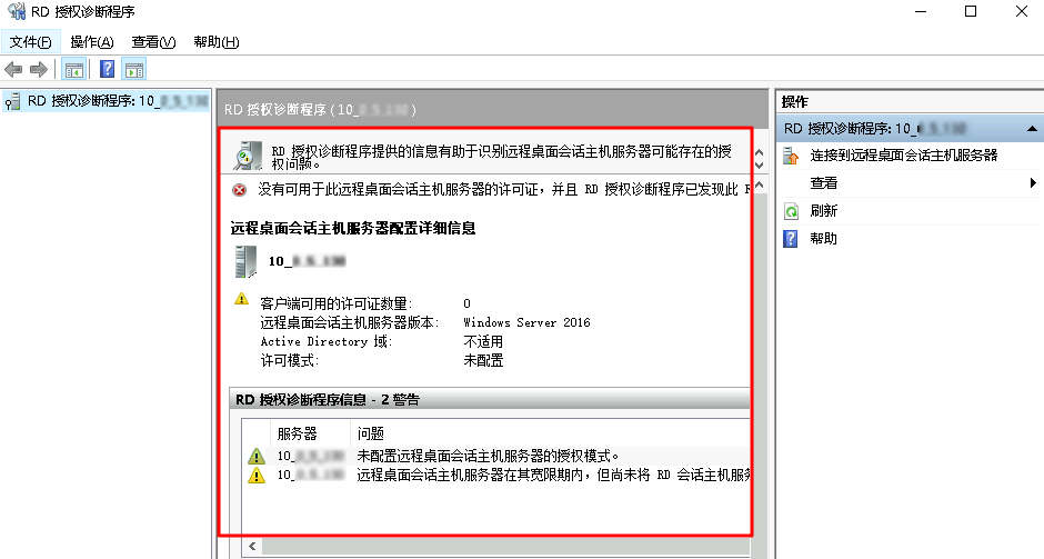 2. 在服务器管理器窗口中,选择右上角的工具 > Remote Desktop Services > 远程桌面授权诊断程序。查看当前服务器状态,如下图所示: