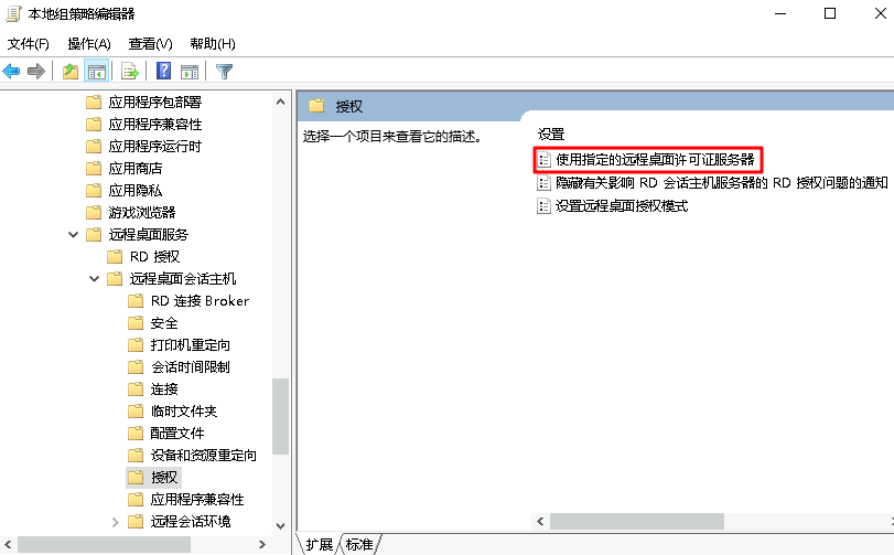5. 在左侧导航树中,选择计算机配置 > 管理模板 > Windows 组件 > 远程桌面服务 > 远程桌面会话主机 > 授权,双击打开使用指定的远程桌面许可服务器。如下图所示:
