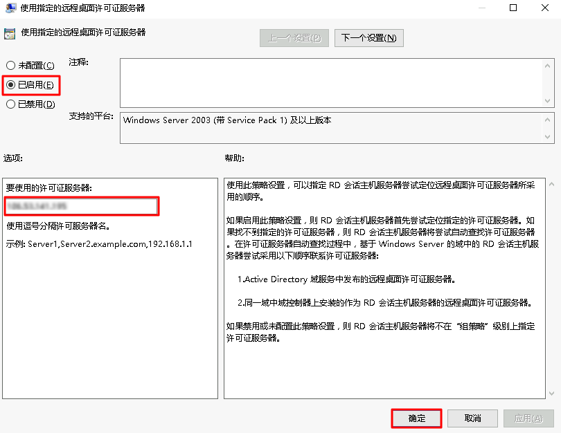 6. 在弹出的使用指定的远程桌面许可证服务器窗口中,选择已启用,并在选项中输入要使用的许可证服务器,可输入轻量应用服务器公网 IP 或主机名。设置完成后单击确定。如下图所示: