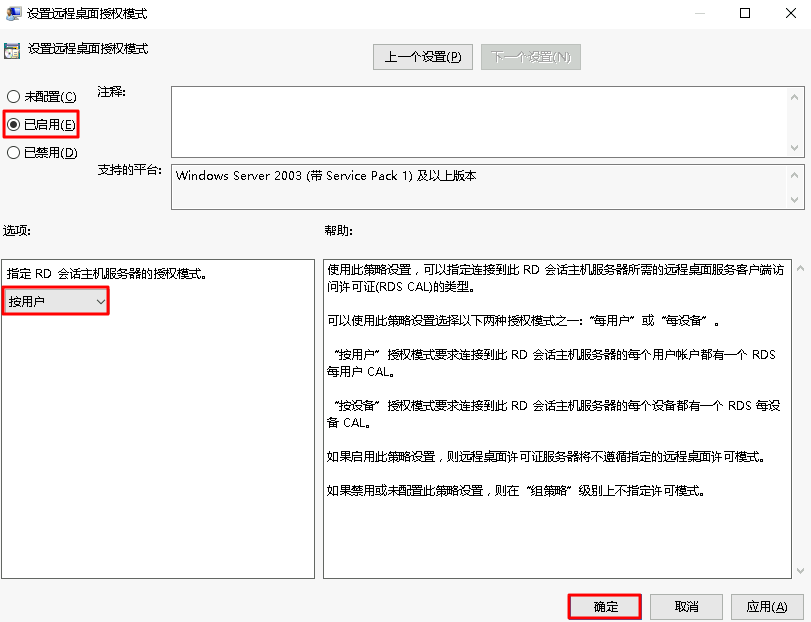 8. 在弹出的设置远程桌面授权模式窗口中,选择已启用,并指定 RD 会话主机服务器的授权模式为按用户。设置完成后单击确定。如下图所示: