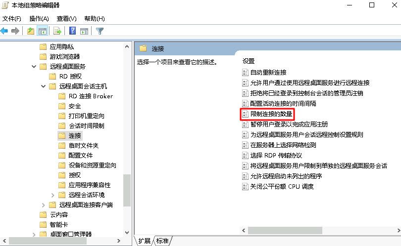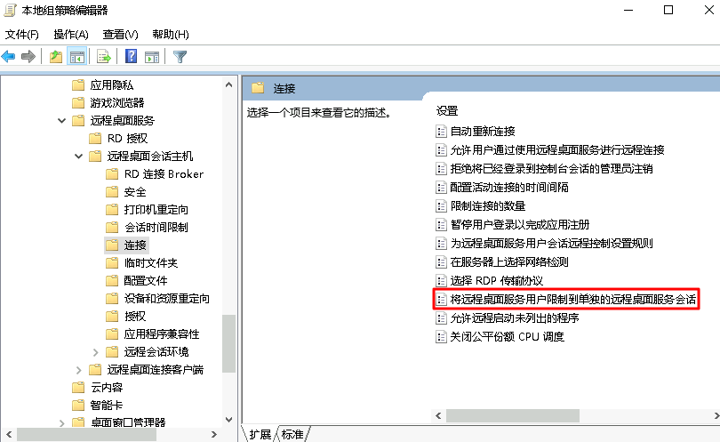 3. 在左侧导航树中,选择计算机配置 > 管理模板 > Windows 组件 > 远程桌面服务 > 远程桌面会话主机 > 连接,双击打开将远程桌面服务用户限制到单独的远程桌面服务会话。如下图所示: