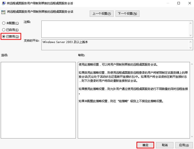 4. 在弹出的使用指定的远程桌面许可证服务器窗口中,选择已禁用,以允许用户通过使用远程桌面服务进行不限数量的同时远程连接。设置完成后单击确定。如下图所示: