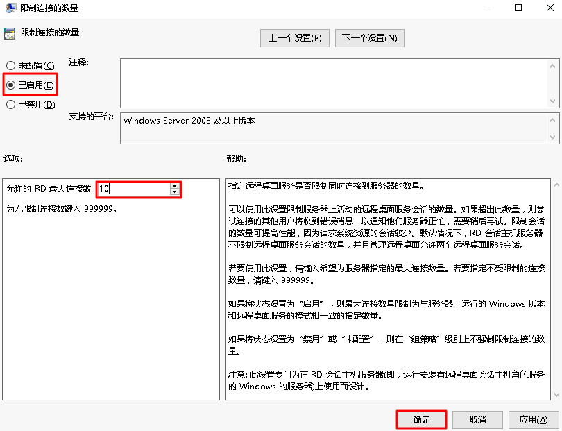 6. 在弹出的限制连接的数量窗口中,选择已启用,并根据实际需求填写允许 RD 最大连接数。设置完成后单击确定。如下图所示: