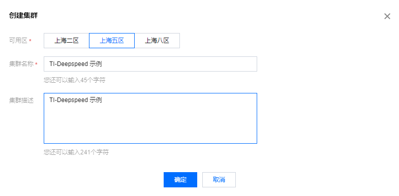 3. 在弹出的创建集群页面中,按需选择可用区、输入集群名及描述,单击确定创建集群。