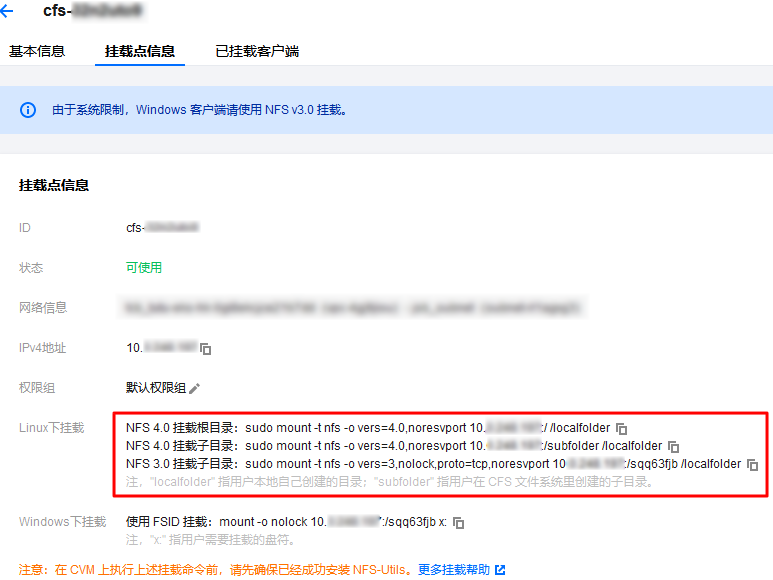参见 创建文件系统及挂载点,创建 CFS 并获取挂载命令。本文以创建名称为 TI-Deepspeed示例的 CFS 为例,获取挂载命令如下图所示: