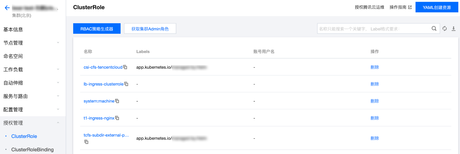 3. 在集群详情页面中,选择左侧授权管理 > ClusterRole。如下图所示: