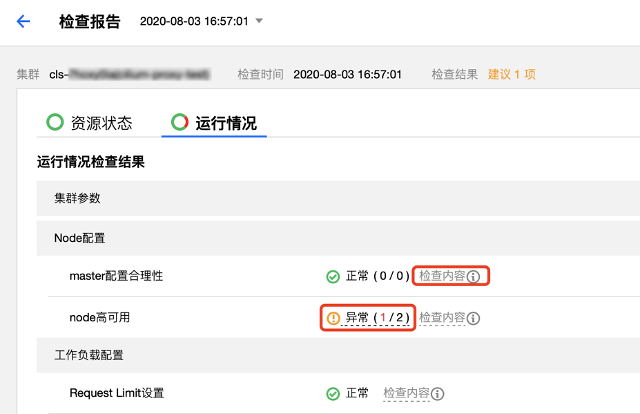 在检查报告页面,选择资源状态和运行情况分别查看资源状态和异常情况,单击检查内容可展示具体的检查内容,单击异常可查看异常级别、异常描述、异常原因、异常影响和修复建议。如下图所示: