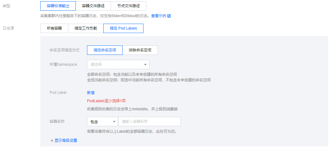 日志源支持所有容器、指定工作负载、指定 Pod Labels 三种类型。如下图所示: