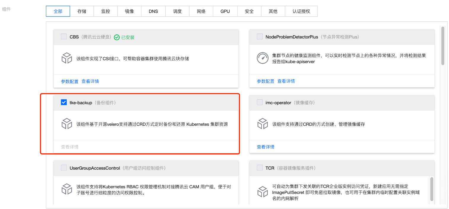 若您之前在集群中已安装社区开源备份组件如 velero,需要提前卸载,否则会影响 TKE 备份组件的正常安装。
