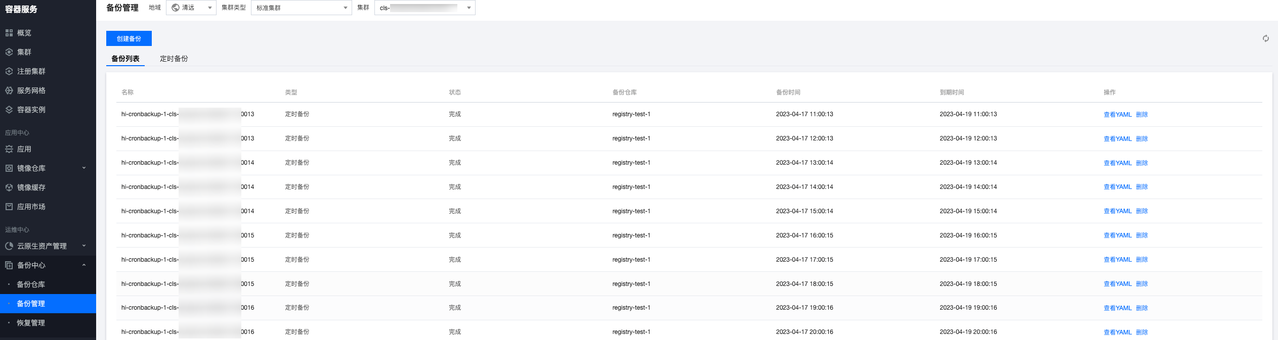 定时备份:创建资源对象 BackupSchedule,该对象会根据您设置的规则定时创建 Backup 备份任务。