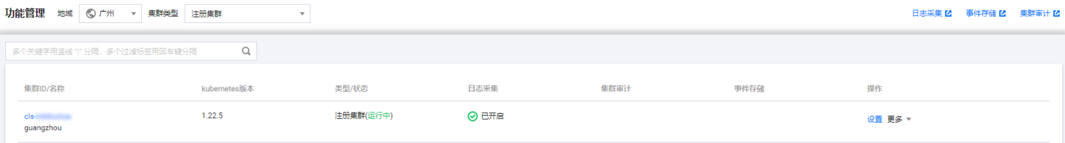 2. 在“功能管理”页面上方选择地域和注册集群,单击希望开启集群审计的集群右侧的设置。如下图所示: