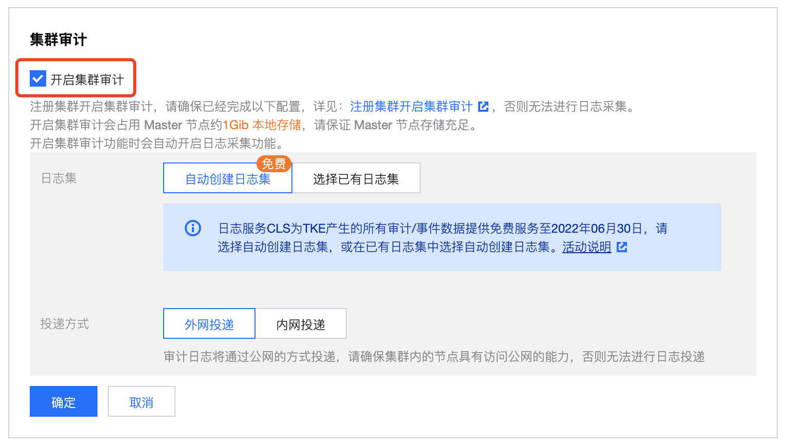 公网投递:集群审计日志将通过公网的方式进行投递至日志服务 CLS ,需要集群中的节点具有访问公网的能力。