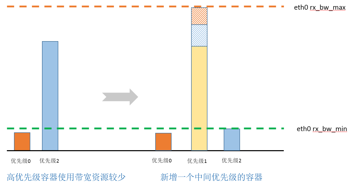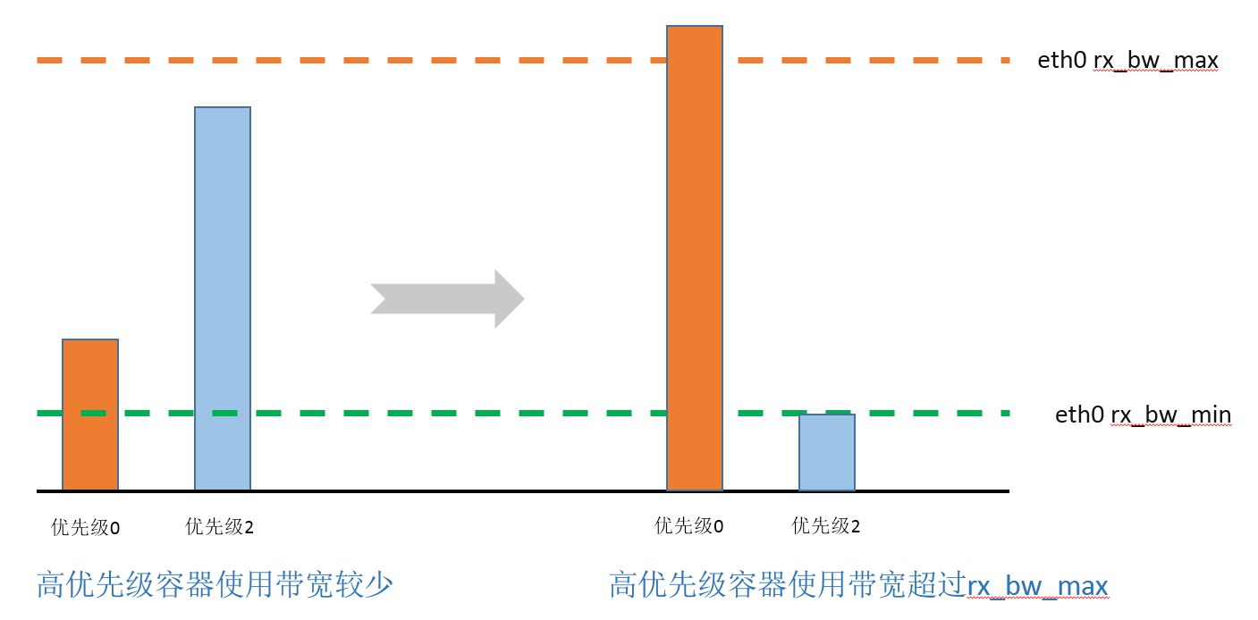 所有较低优先级(优先级为1、2)容器使用的带宽之和小于 rx_bps_max 减最高优先级带宽时,每个容器可以使用的带宽不受限制,并都可以超过 rx_bps_min。