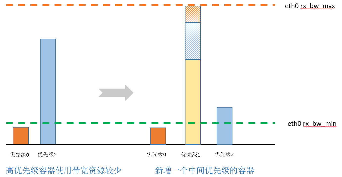 新增一个中间优先级的容器时,抢占相对较低优先级容器的带宽。最多能抢占的带宽要减去较高优先级容器所用带宽,还要减去较低优先级容器最低保障带宽。