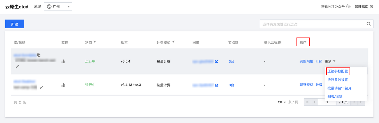 2. 进入“etcd 集群”列表页面,在页面上方选择相关地域,在下方集群列表中找到您需要操作的 etcd 集群。