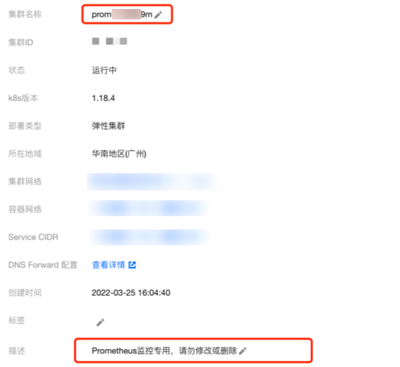 该 TKE Serverless 集群的名称为 Prometheus 监控服务实例的 ID,集群描述里面说明为 “Prometheus监控专用,请勿修改或删除”。