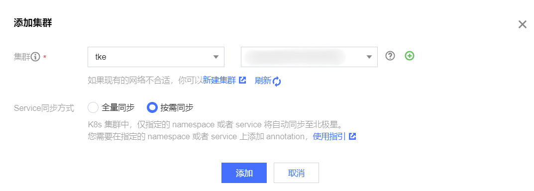 3.2 也可以根据业务的特点选择服务的同步方式,支持全量同步(同步k8s集群中所定义的全部服务)/按需同步(只同步打了polarismesh.cn/sync标签的命名空间或服务)。