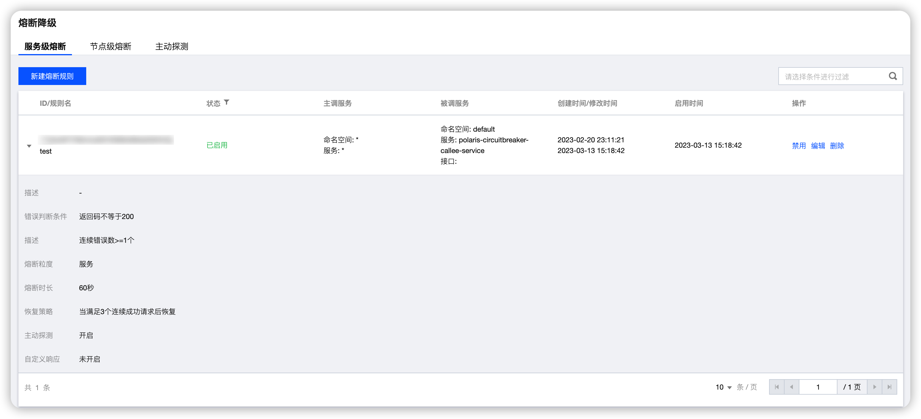 启动应用并在 北极星控制台 设置被调服务的服务级熔断规则;请参见 服务治理指南 > 服务治理 > 熔断降级 > 服务熔断与主动探测 相关文档,相关界面如下: