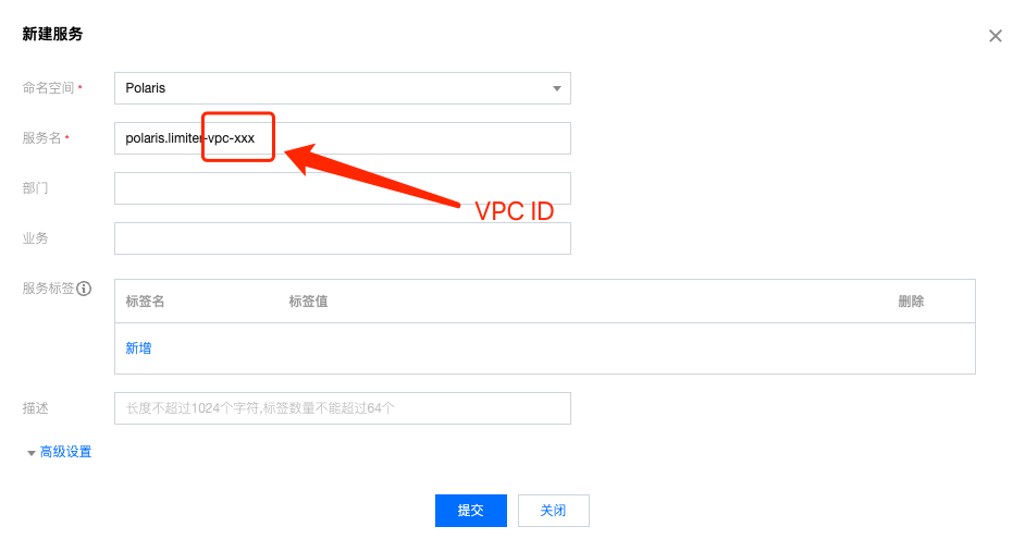 2. 针对每一个内网 VPC 的 IP 地址,在命名空间 Polaris 下创建服务 polaris.limiter-{vpc 名称}。