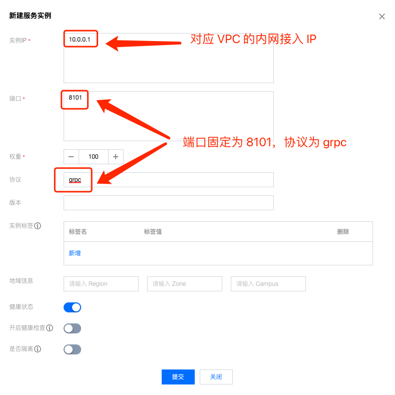3. 单击服务 polaris.limiter-{vpc 名称},进入到服务的实例页面,根据对应上述第一步所记录的 VPC 内网 IP 地址以及端口协议 grpc 创建实例。