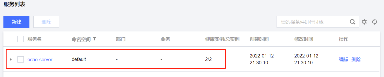 在容器环境下,用户开发完被调端的服务后,可以通过 关联 K8s 集群 的方式,将通过容器部署的服务,自动注册到北极星上(默认会使用default命名空间进行注册),注册后如下图:
