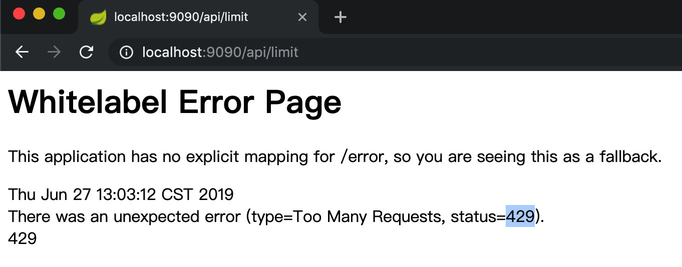 5. 手动打开 http://localhost:9090/limit,页面显示 429 访问过载: