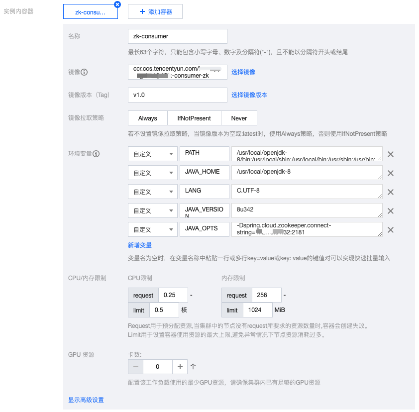 环境变量:新增环境变量 JAVA_OPTS 并指定为 -Dspring.cloud.zookeeper.connect-string=[TSE Zookeeper注册中心实例访问IP:2181]