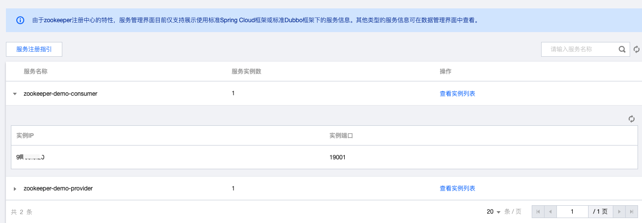 登录 TSE 控制台,在左侧导航栏选择 zookeeper,单击目标实例的 ID,进入基本信息页面。在页面上方选择服务管理页签,若出现以下页面,则证明服务注册成功。