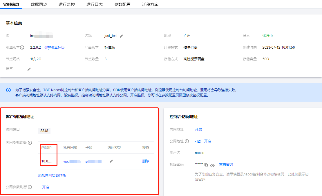 3. 在页面上方选择"基本信息"页签,可以获取 Nacos 注册中心实例访问 IP。