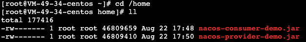7. 登录云服务器,进入到刚刚上传 jar 文件所在的目录,可看到文件已上传到云服务器。