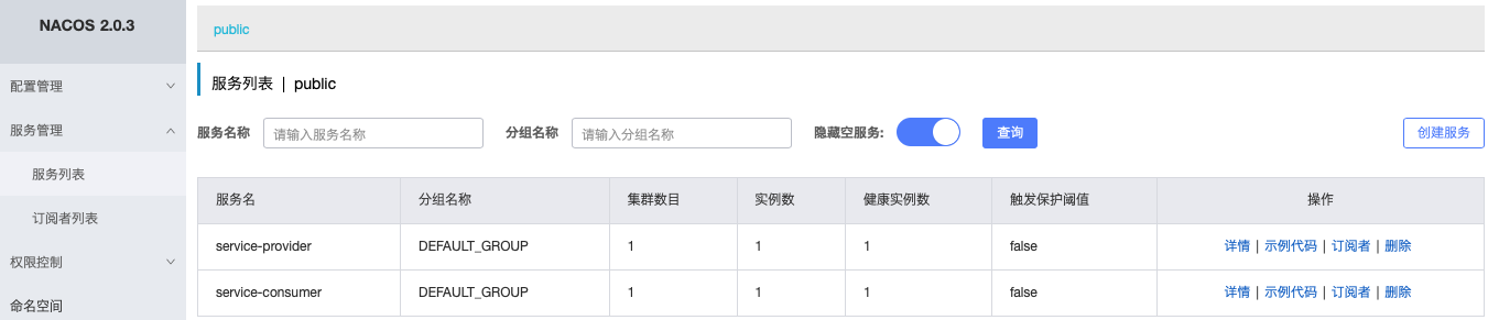 11. 在 Nacos 原生控制台页面,选择服务管理 > 服务列表,可以看到注册成功的服务。