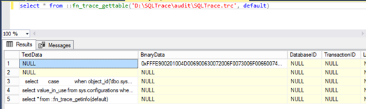 select * from ::fn_trace_gettable(‘D:\SQLTrace\audit\SQLTrace.trc’, default)