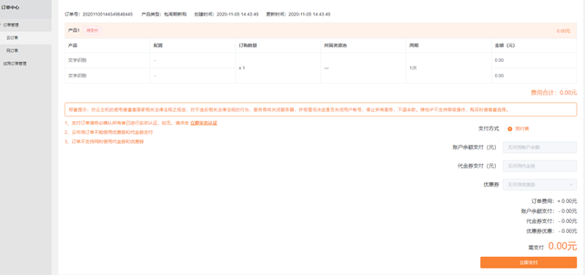 用户勾选服务协议,点击“立即购买”,进入订单支付页面