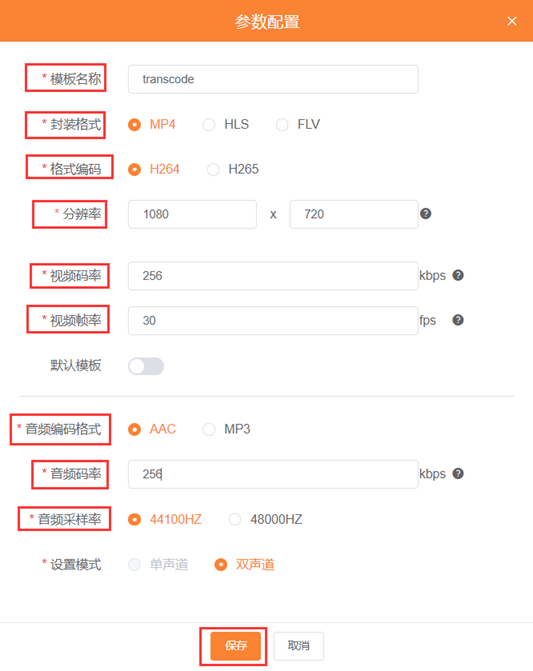 在配置页面分别填写模板名称、封装格式、格式编码、分辨率、视频码率、视频帧率、音频编码格式、音频码率、音频采样率,最后单击【保存】。如下图: