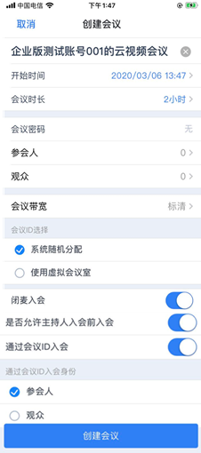 | 会议ID 选择 | 单选框,默认选择“系统随机分配”。 |