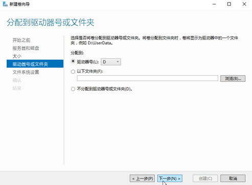 12. 分配到驱动器号或文件夹,系统默认为磁盘分配驱动器号,驱动器号默认为“D”,此处以保持系统默认配置为例,单击“下一步”。