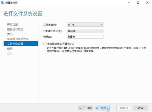 13. 选择文件系统设置,系统默认的文件系统为NTFS,并根据实际情况设置参数,此处以保持系统默认设置为例,单击“下一步”。