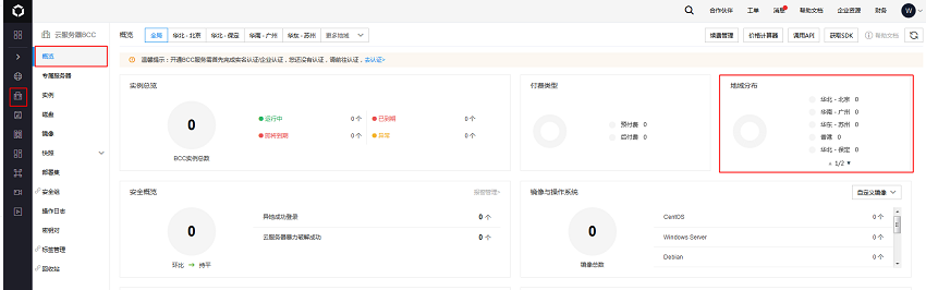 登录 云服务器BCC控制台 进入“概览”页面,可以在“地域分布”处查看实例的分布情况。