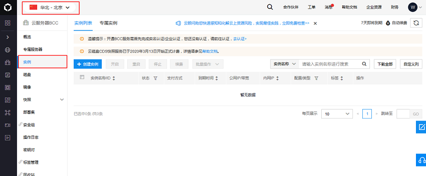 选择区域后即可进入实例列表页面,可看到您已创建的云服务器列表,如下图所示。