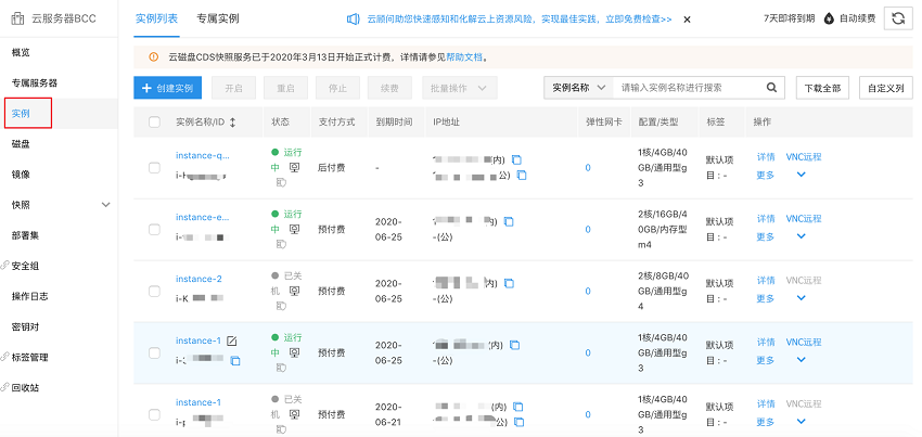 完成BCC实例创建后,您可以在实例列表中查看已经创建完成的BCC实例,可以按照实际需求完成关联安全组、创建快照、创建自定义镜像等操作。
