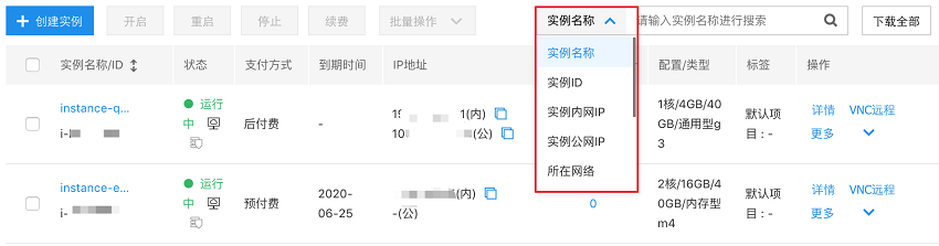 如果实例较多,您可以通过“实例名称”、“实例ID”、“实例内网IP”、“实例公网IP”等进行快速搜索,如下图所示。
