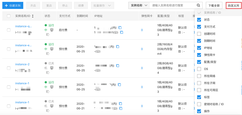 如需自定义查看实例列表项,您可以单击顶部右侧的 “自定义列” 按钮,自定义显示的实例列表项,如下图所示。