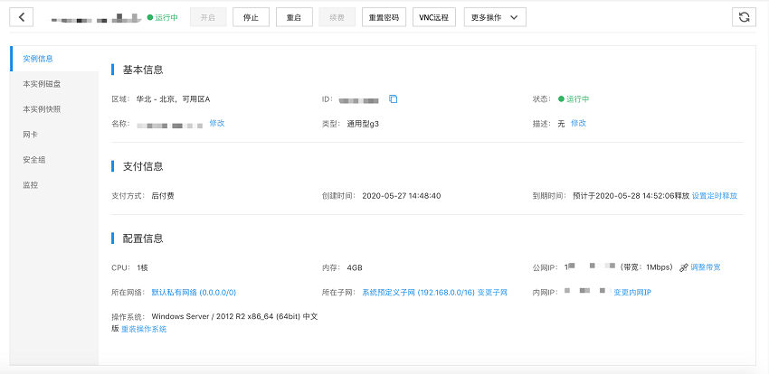 - 在“实例详情”页签中,您可以查看该实例的基本信息、付费信息和配置信息。同时可以根据实际需求对实例信息进行修改或者升级配置等操作:变更实例名称、添加实例描述、重置密码、VNC远程、设置定时释放(按需计费实例)、配置升级、带宽调整、重装操作系统。