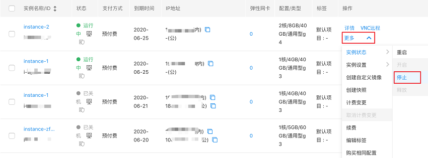 停止单个实例:选择您要停止的实例,在右侧操作列单击 “更多 - 实例状态 - 停止”,如下图所示。